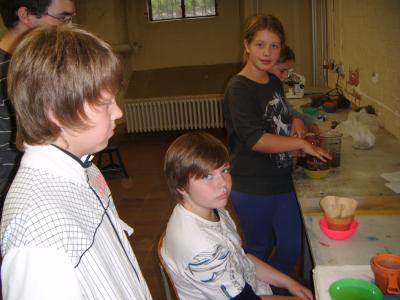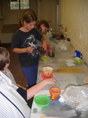 Als Sinnbild für verschmutztes Abwasser konnte ich Wasser aus dem nahegelegenem Bach entnehmen. Beim Eintreffen der Schüler und Schülerinnen erkundigte ich mich, ob sie davon denn trinken würden oder nicht, und nach dem warum. Die erste Aufgabe war nun, eine Methode zu wählen, mit der man diese Probe ,,sauberer" machen konnte, und fast alle Gruppen nannten sofort die Filterung als sinnvolle Technik. In Form eines Experimentes hatten die Schülerinnen und Schüler die Aufgabe, unterschiedliche Filtermaterialien auszuprobieren und ihre Effektivität untereinander zu vergleichen. Dazu lagen neben Schalen zum auf fangen des Wassers und kleinen Blumentöpfen als Gerüst der Konstruktionen mehrere unterschiedliche Filtermaterialien zur Verfügung. Dabei konnten die Schüler und Schülerinnen auswählen zwischen Watte, Kies, Sand, einem Sieb und Kaffeefilter.